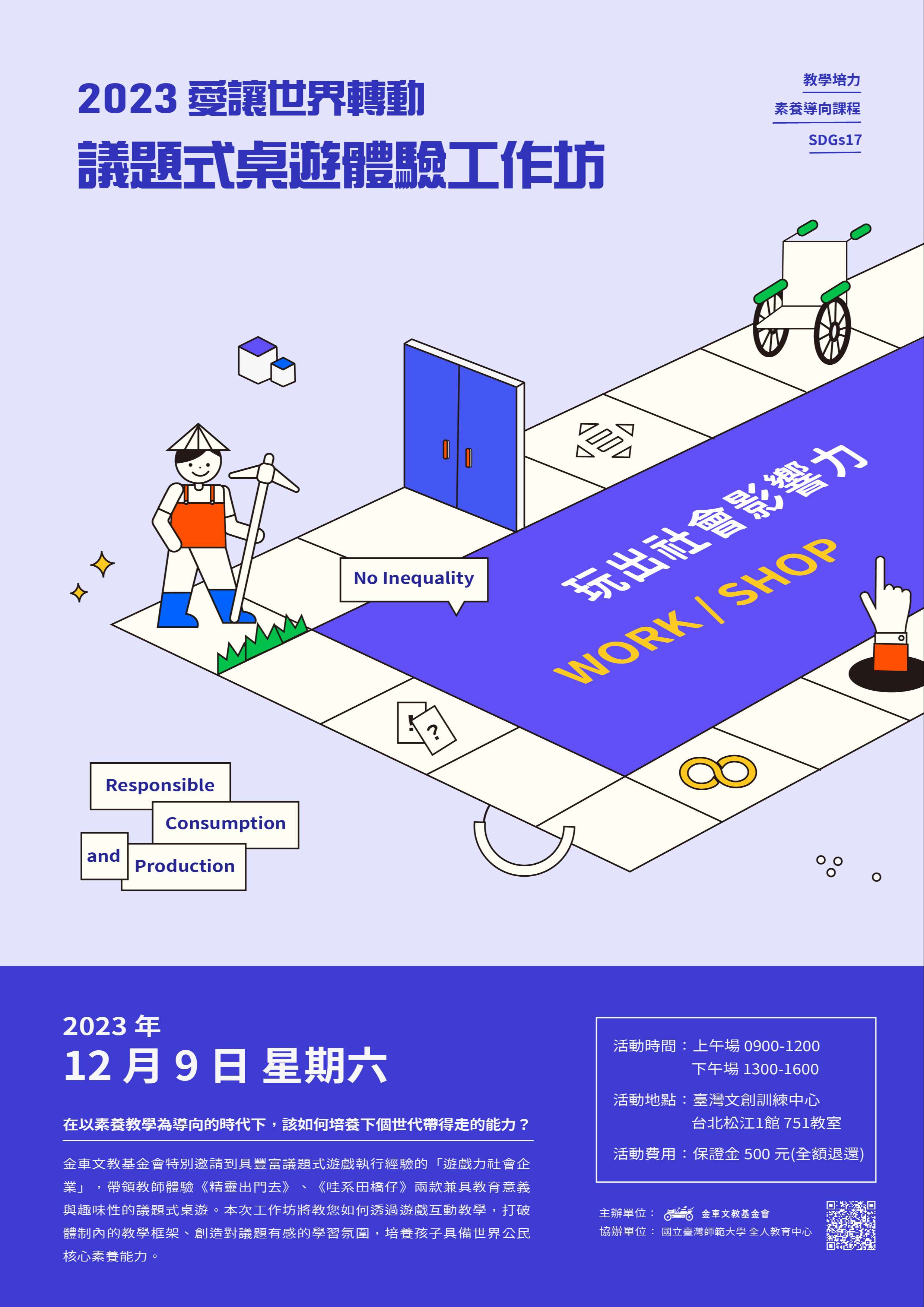一、金車文教基金會長期深耕國際素養教育,定期辦理教師增 能課程,本次工作坊特別邀請到「遊戲力社會企業」,從 SDG10-消弭國家不平等和SDG12-永續生產與消費主題出 發,帶領教師體驗《精靈出門去》、《哇係田橋仔》兩款 兼具教育意義與趣味性的議題式桌遊。課程中將分享如何透過遊戲導向式教學,跳脫傳統教學框架,創造對議題有 感的學習氛圍,培養孩子具備「問題解決」、「團隊合 作」、「行動實踐」的世界公民核心素養能力。