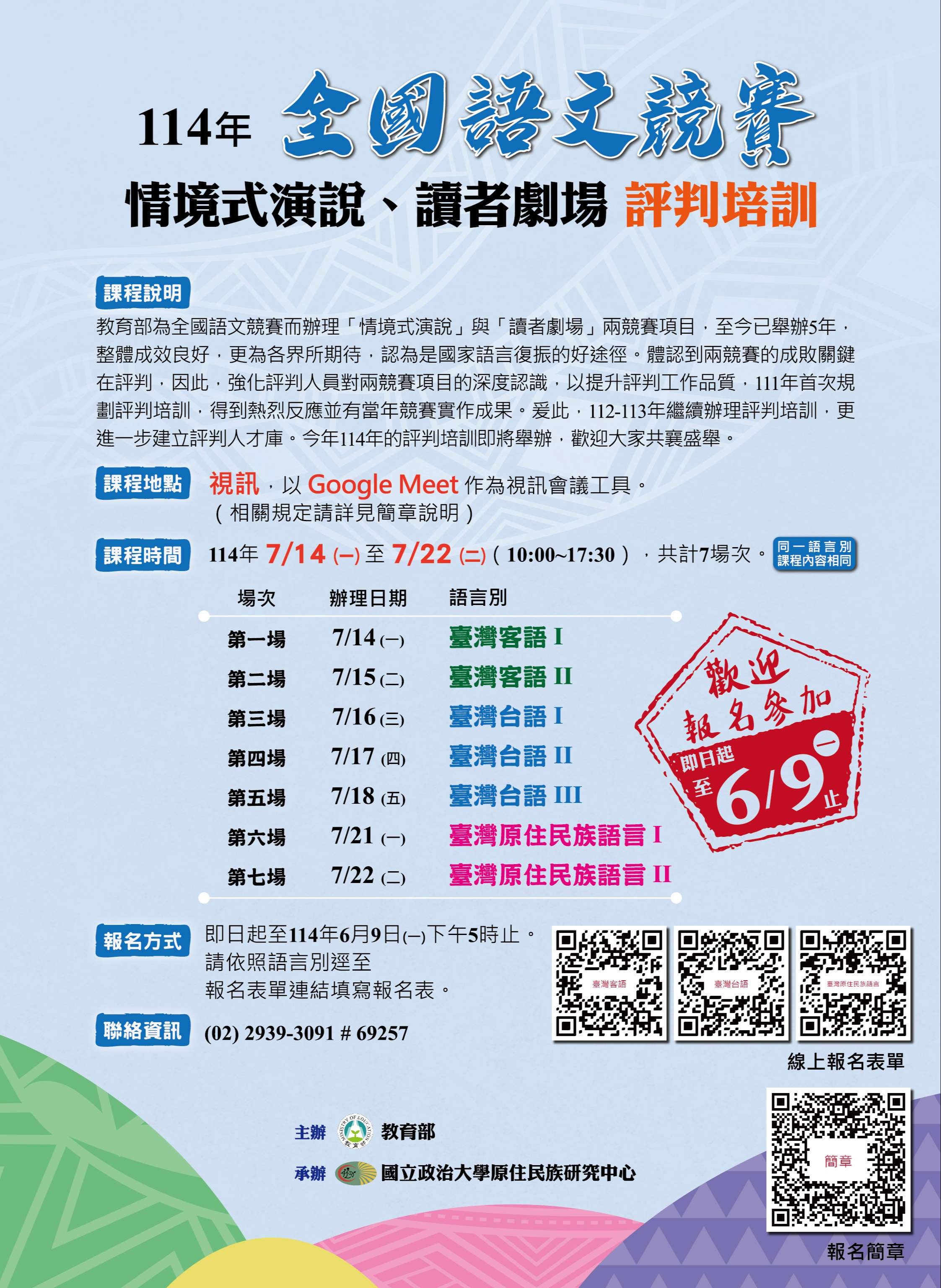 (三)培訓時間及場次:自114年7月14日(星期一)至7月22日(星期二),臺灣客語2場,臺灣台語3場及臺灣原住民族語言(不分民族語言別)2場,共計7場。