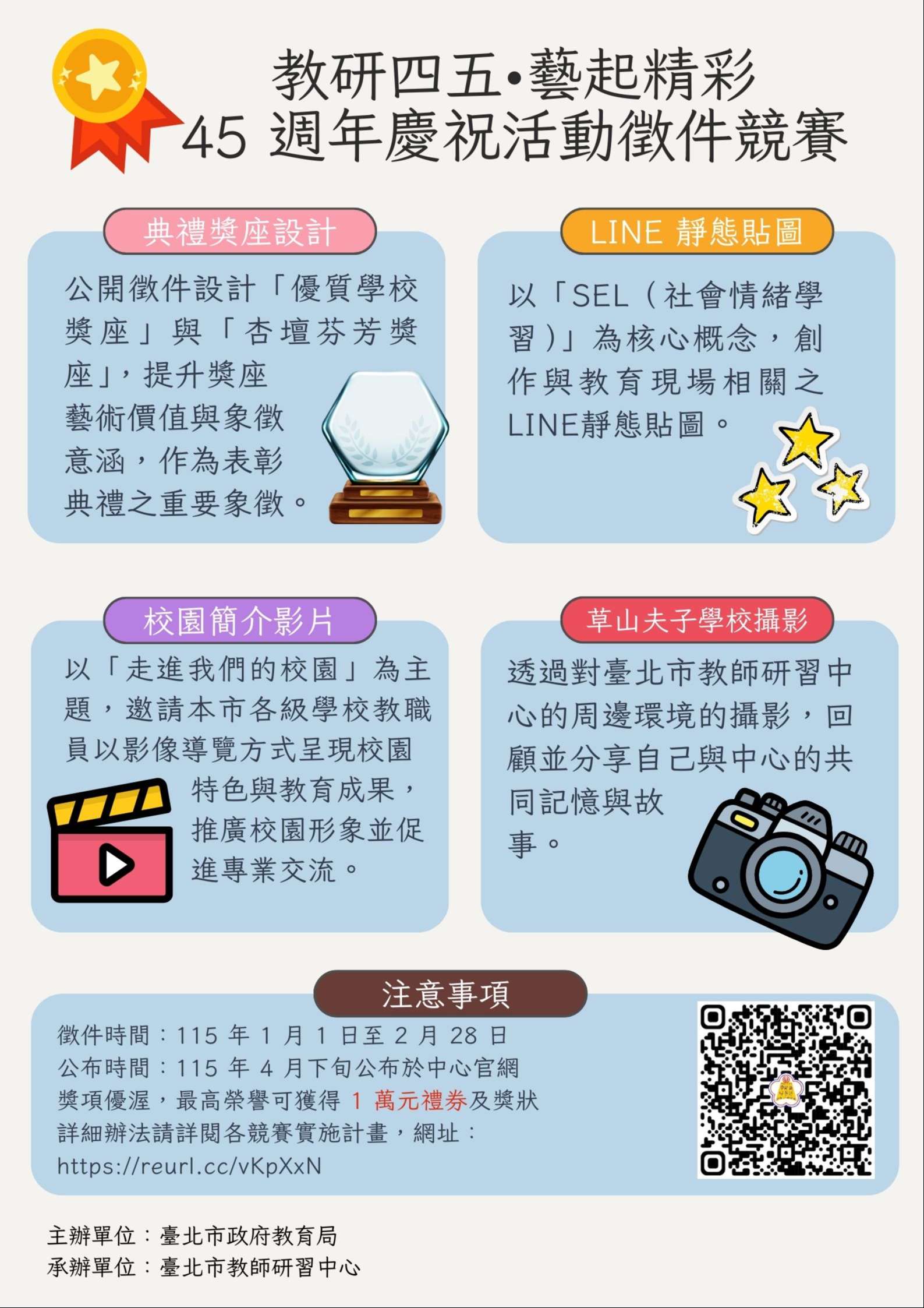 一、臺北市教師研習中心將於明年迎來創立45週年慶。為紀念此一重要里程碑,週年慶系列活動將回顧四十五年來的發展歷程與教育成果,並規劃多元慶祝內容。期盼藉此凝聚教育專業能量,共同開創教育的嶄新未來。配合本中心45 週年慶,規劃辦理4項競賽活動,以凝聚教育專業能量並展 現創新成果: