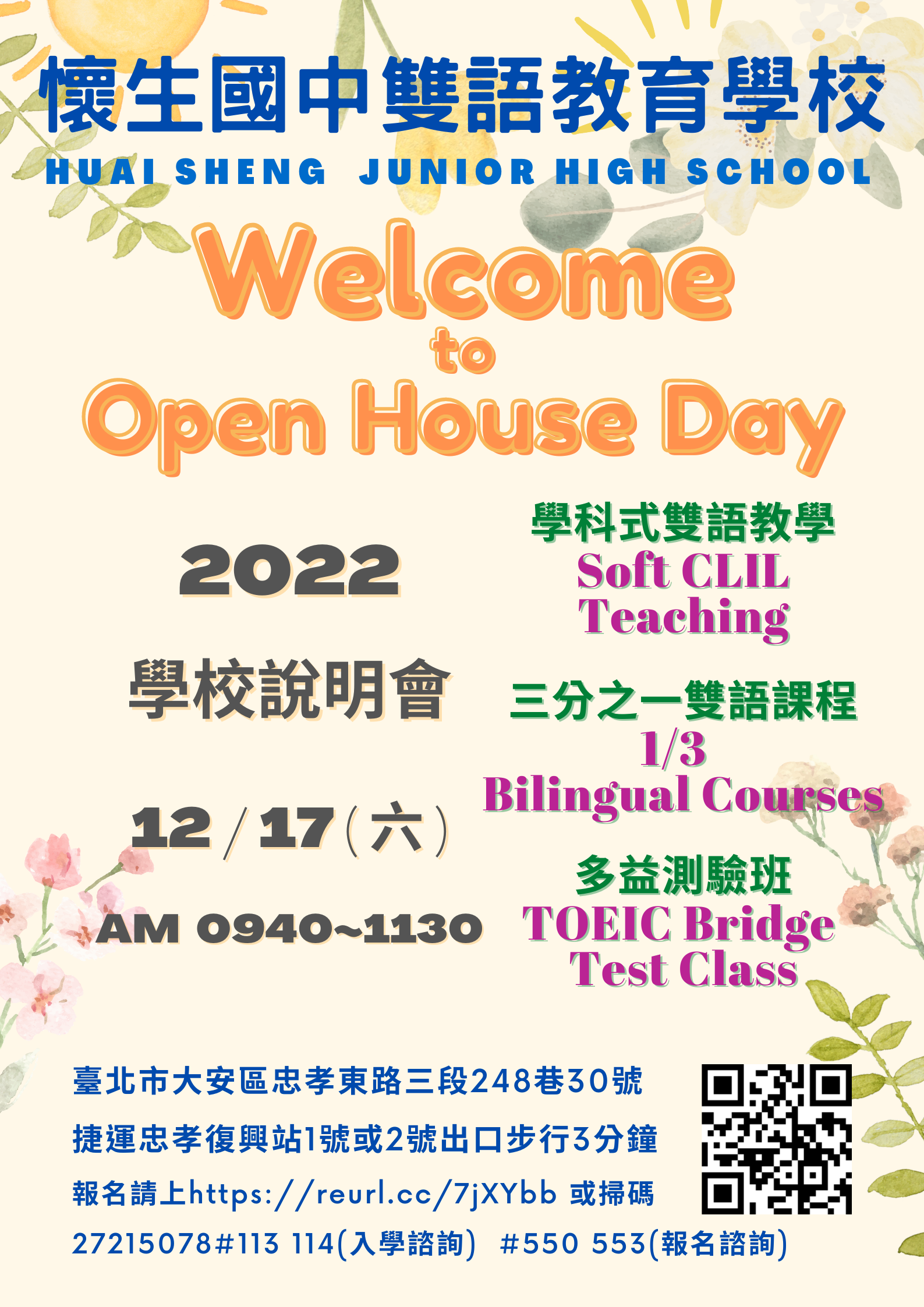 一、懷生自109學年度升格為雙語教育學校,辦理校園開放參觀 日(Open House Day),提供國小應屆畢業生及家長,了解 本校辦學理念、各項特色課程及學校教學環境。
