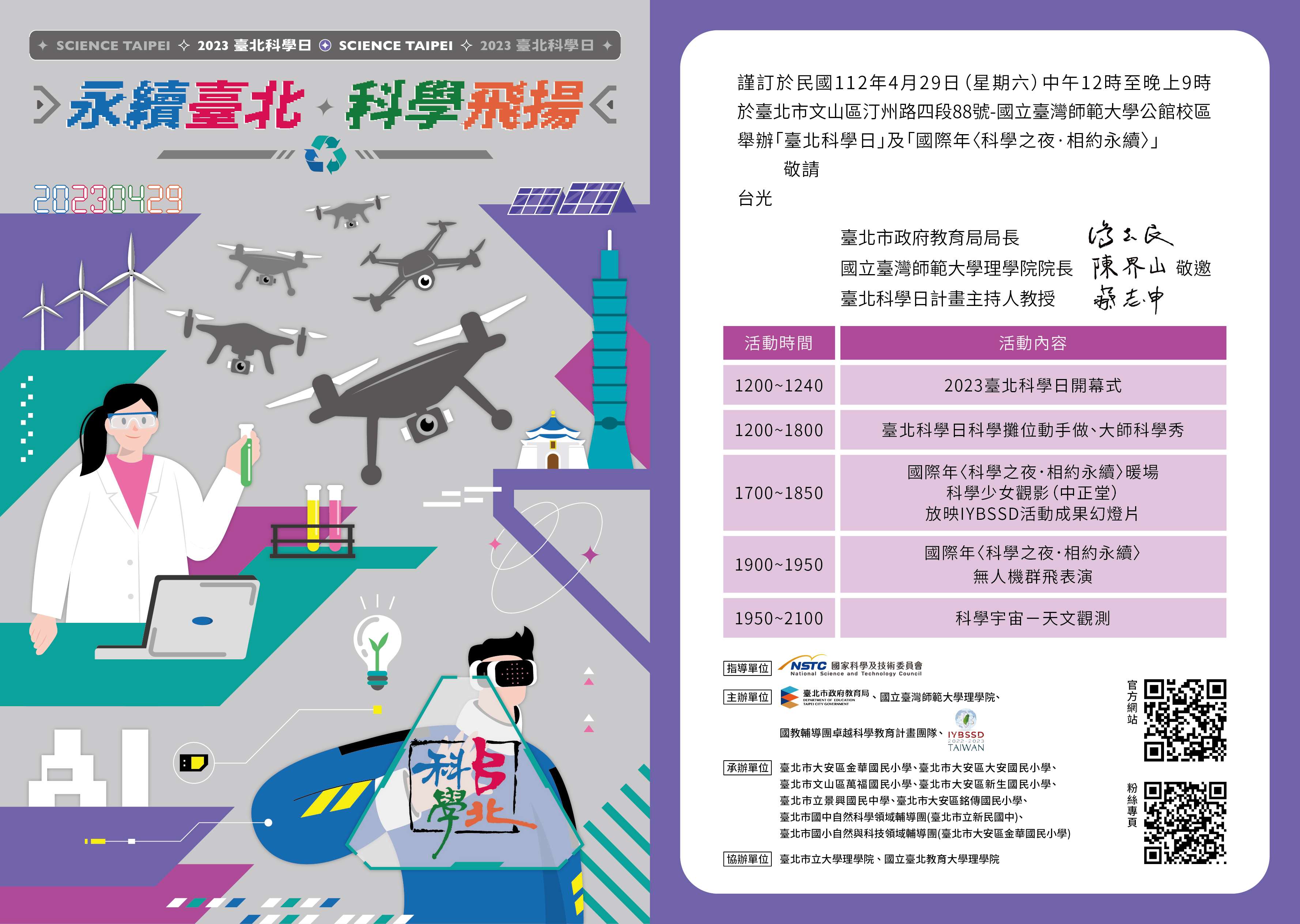 本年度將於112年4月29日(星期六)假師大公館校區 辦理科學體驗實作活動,並響應聯合國教育科學及文化組織「基礎科學促進永續發展國際年」理念,藉本活動「永 續臺北—科學飛揚」之主題,彰顯本市對於推動科學教育的重視。