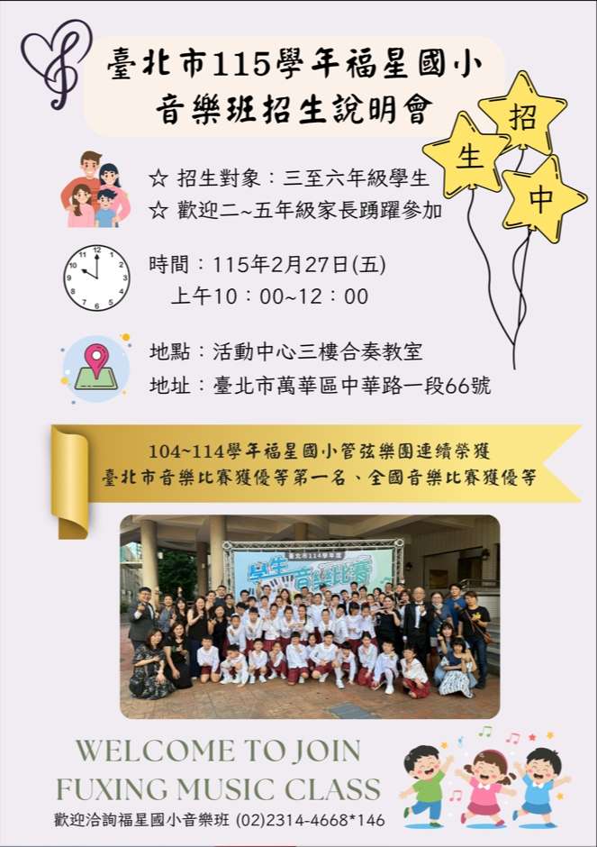 二、招生說明會資訊如下:時間:115年2月27日星期六上午10: 00。地點:福星國小學生活動中心三樓合奏教室。(臺北市 萬華區中華路一段66號,捷運北門1號出口站或西門町6號 出口)活動內容:簡介本校藝術才能音樂班及114學年度入 學考試相關內容,並介紹音樂班教學環境與教育特色,以 及國中升學管道之最新資訊。