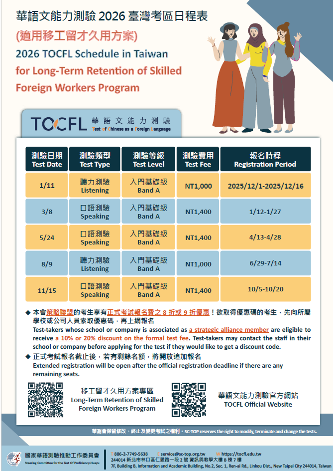 國家華語測驗推動工作委員會 2026年華語文能力測驗定期考試日程表及新版考試規則說明: