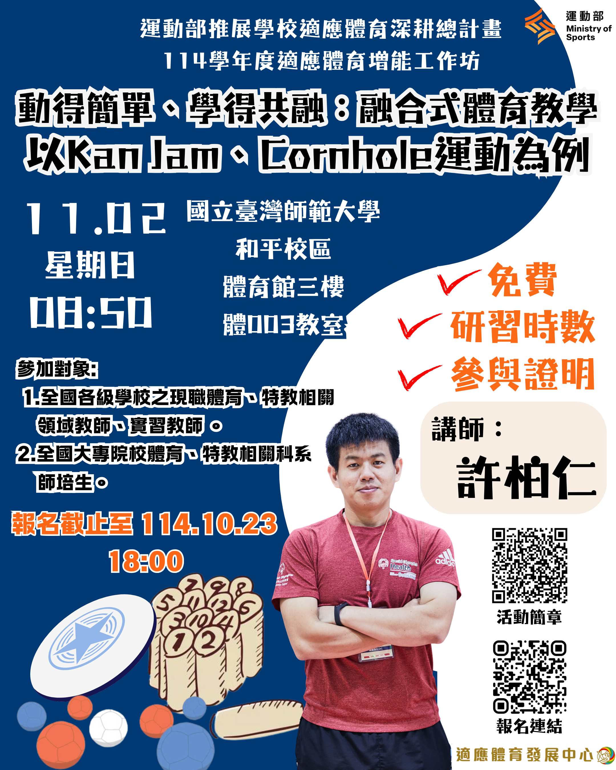 國立臺灣師範大學訂於114年11月2日辦理「114學年度適應體育增能工作坊─動得簡單、學得共融:融合式體育教學,以Kan Jam、Cornhole運動為例」,歡迎踴躍參加!