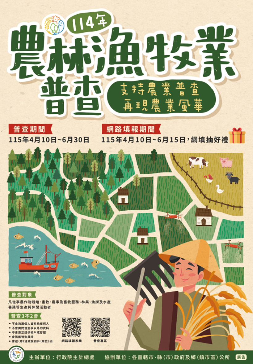 請支持農林漁牧業普查,再現農業風華!臺北市農林漁牧業普查於115 年04 月10 日開跑,06 月15 日前網填抽好禮!